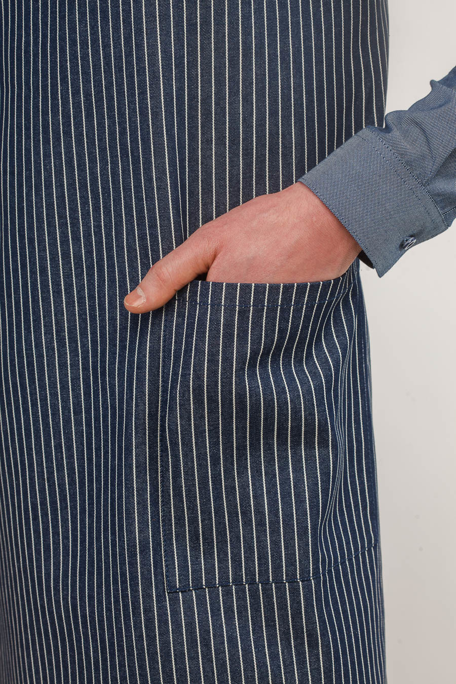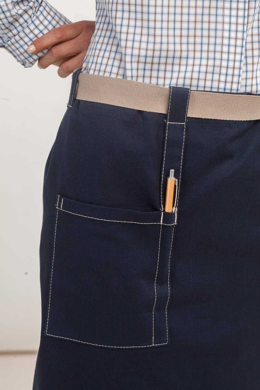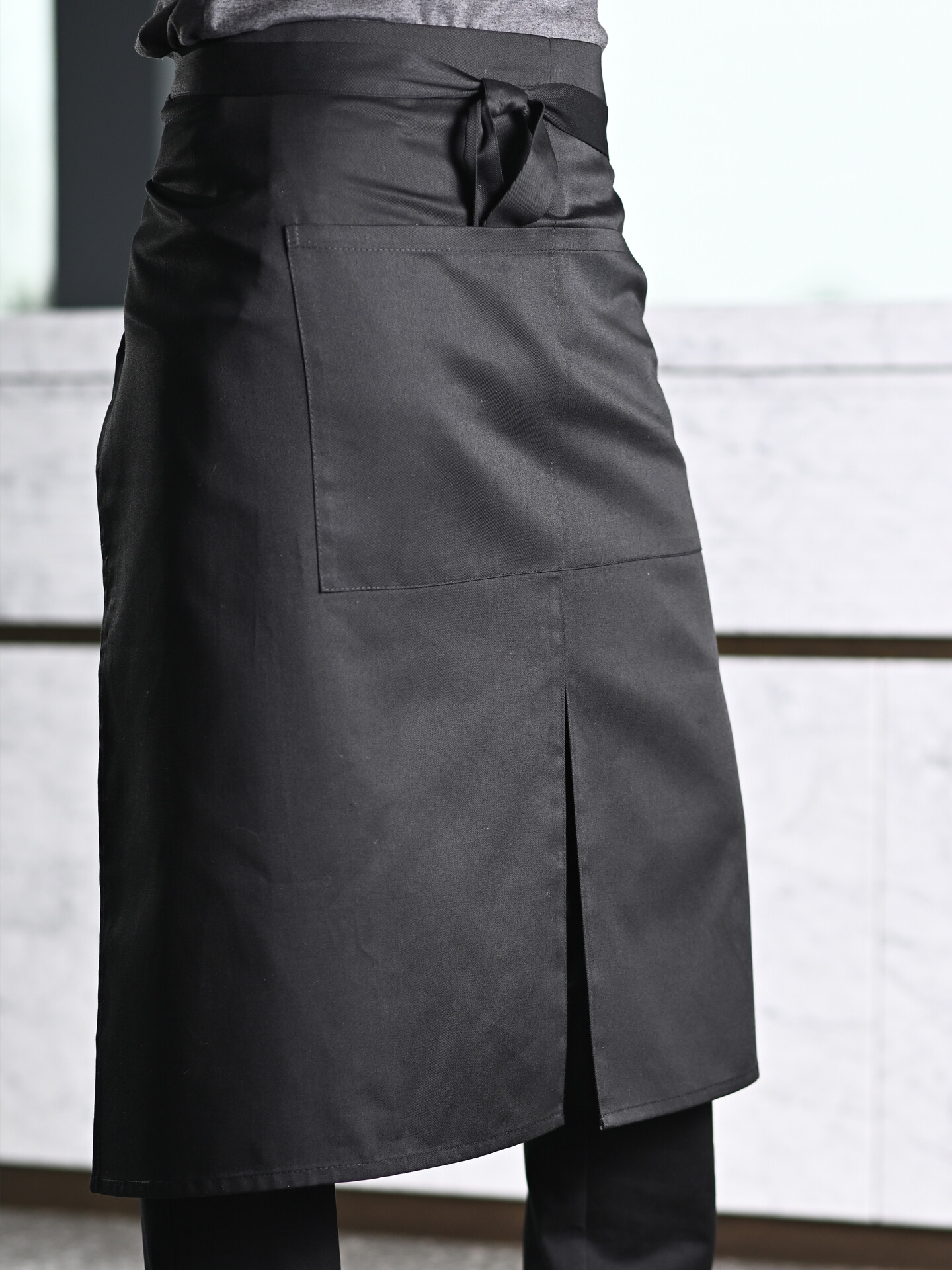 Фартук поясной, прямоугольной формы с притачным поясом. Большой карман посередине, разделенный на два отсека. Посередине фартука разрез.