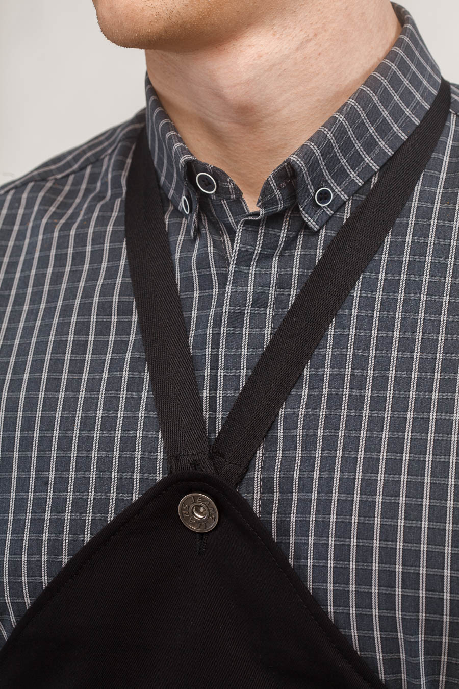 Жилет-фартук «unisex» был разработан с имитацией двубортной застёжки из плотного твила джинсового цвета. Объединяя в себе две модели: жилет и фартук, это изделие решает сразу две задачи. Презентабельный вид и практичность в использовании. Сорочка мужская полуприлегающего силуэта, с центральной потайной застёжкой на 6 петель и пуговиц и одну петлю и пуговицу контрастного цвета на стойке воротника. Рукава длинные с притачными манжетами, застегивающимися на одну петлю и пуговицу, с дополнительной пуговицей. Рукава трансформируются в короткие с патой с 1 прорезной петлей и 1 пуговицей. Углы воротника крепятся к сорочке на петлю и пуговицу контрастного цвета.