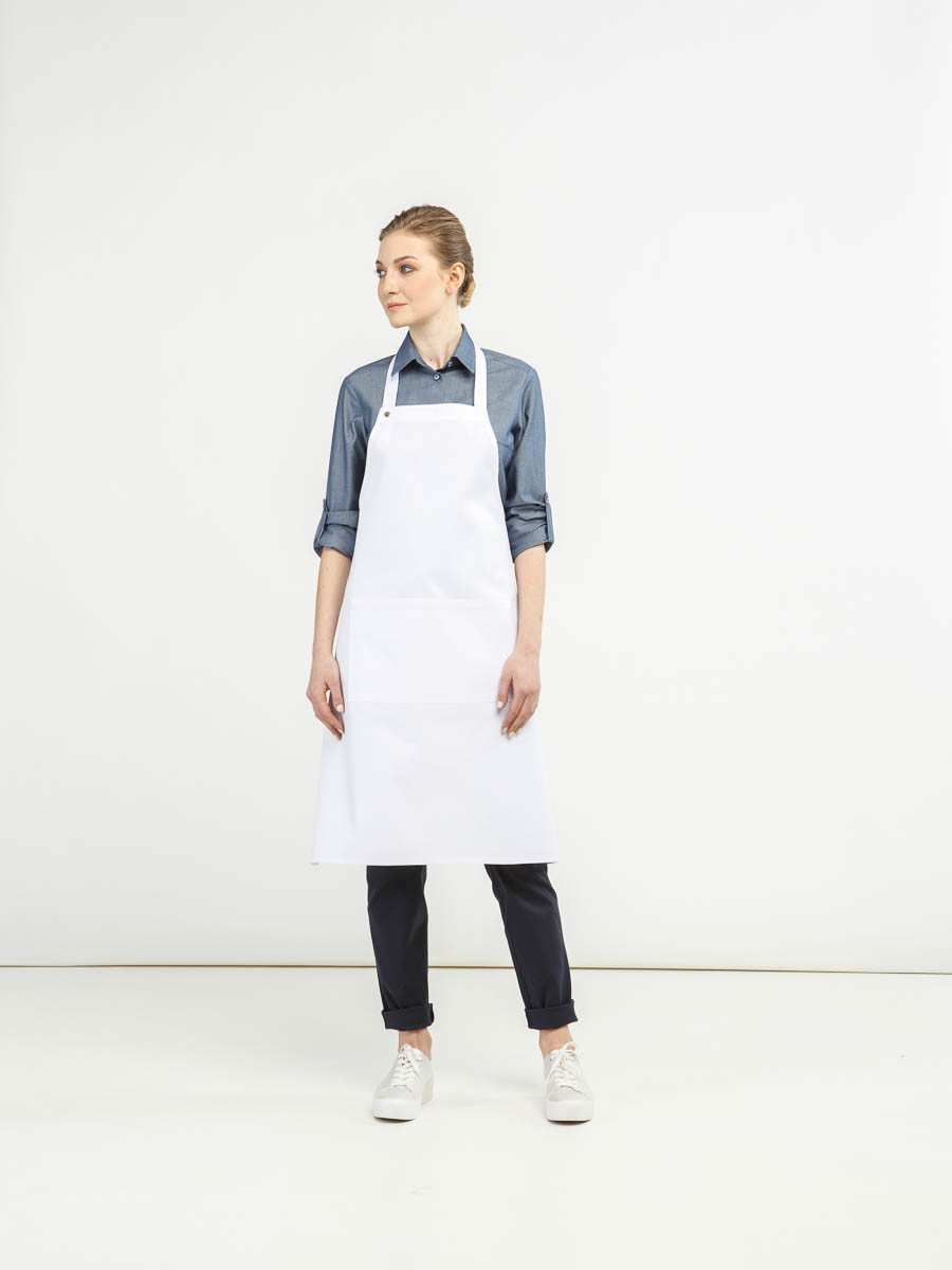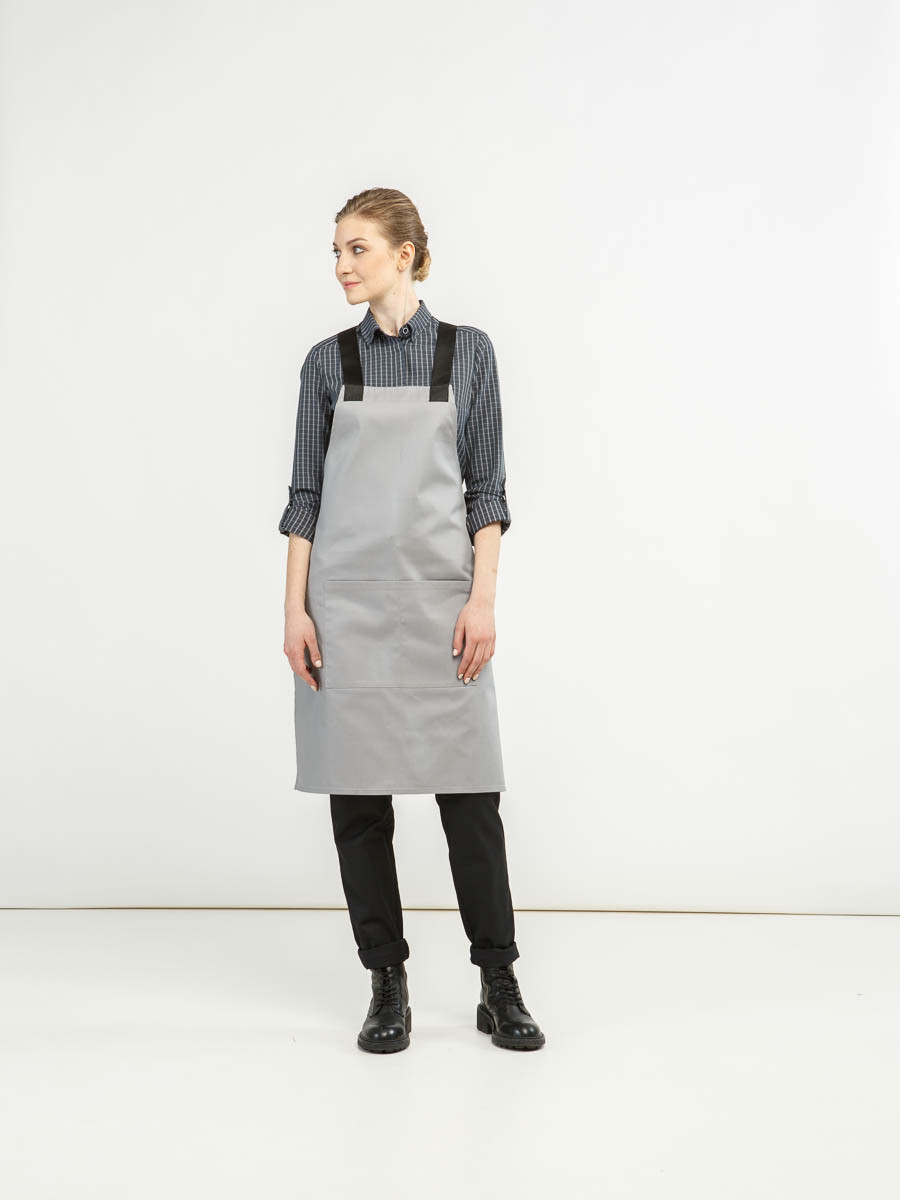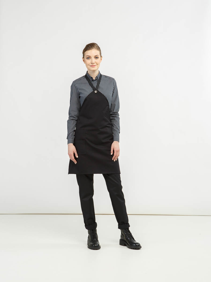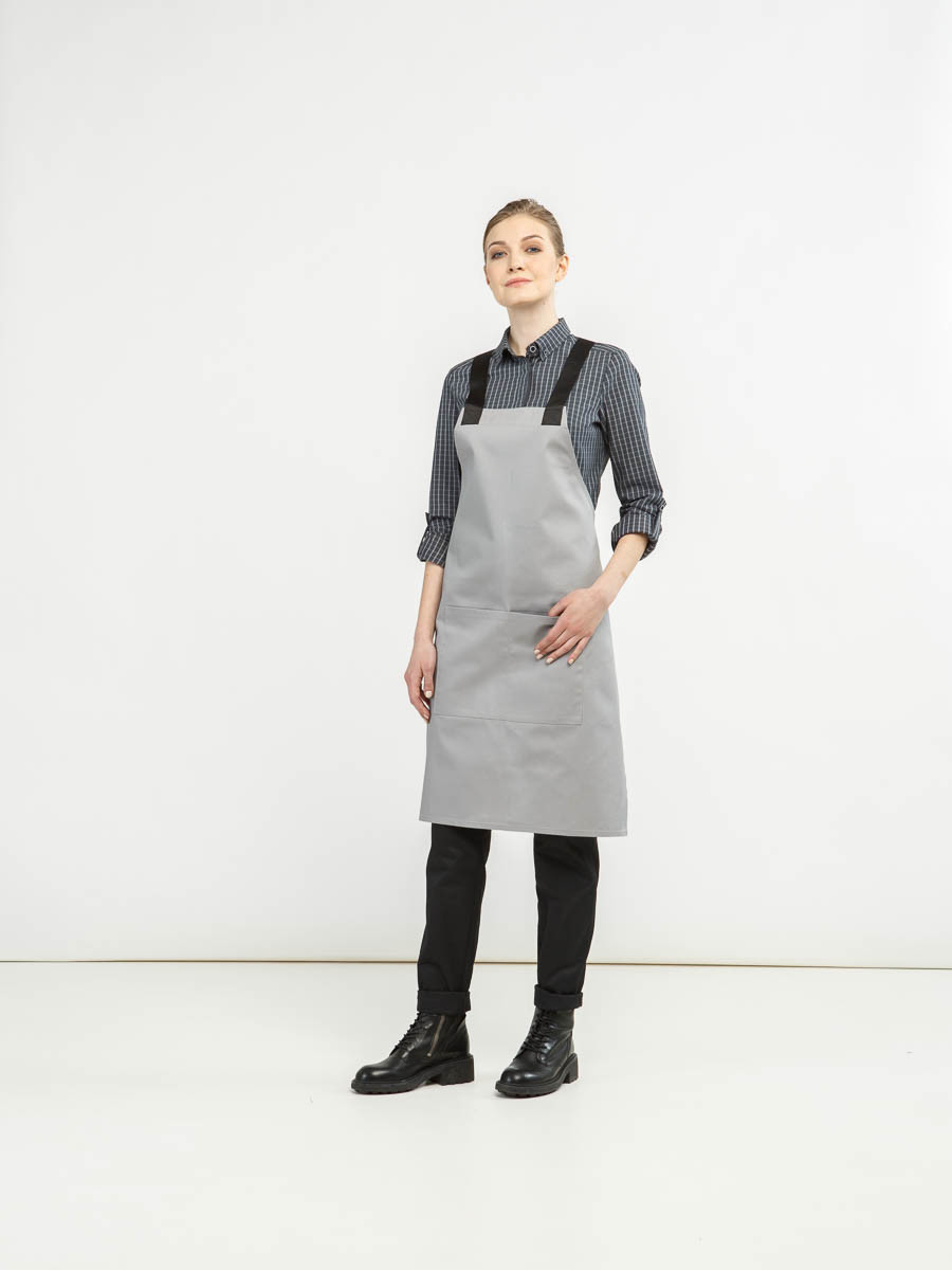Фартук «unisex» с цельнокроеной грудкой и с бретелями, продетыми через люверсы, переходящими в пояс. По центру нижней части фартука расположен один накладной карман с двумя входами. Бретели выполнены из репсовой ленты контрастного цвета. Закрепки на бретелях оформлены нитками контрастного цвета. Блузка женская полуприлегающего силуэта с центральной потайной застёжкой на 6 петель и пуговиц и одну петлю и пуговицу контрастного цвета на стойке воротника. Рукава длинные, с притачными манжетами, застегивающимися на одну петлю и пуговицу и дополнительной пуговицей для регулировки манжеты по ширине. Рукава трансформируются в короткие - патой и фиксируются прорезной петлей и пуговицей. Углы воротника крепятся к блузке на петлю и пуговицу контрастного цвета.