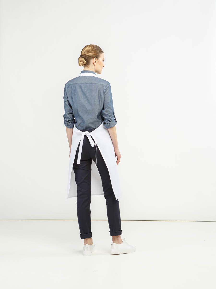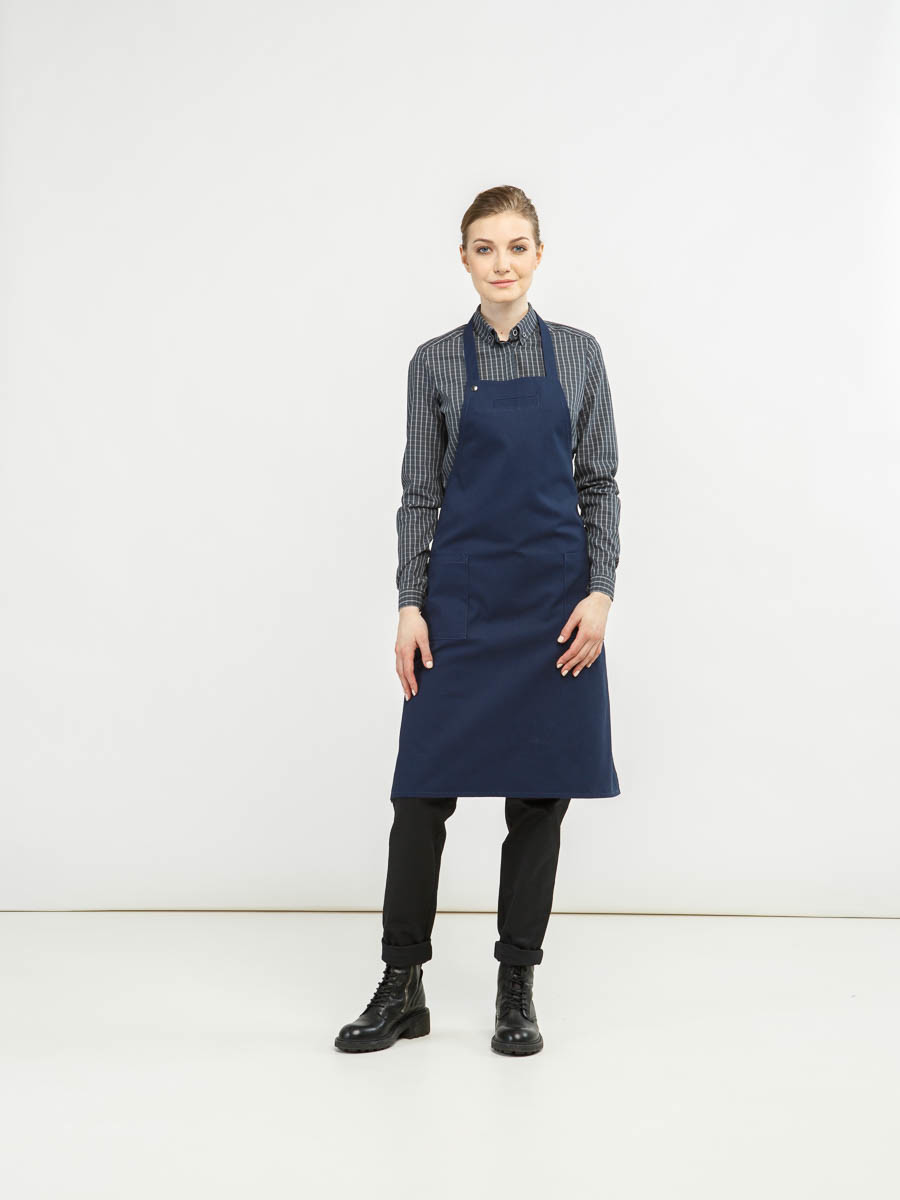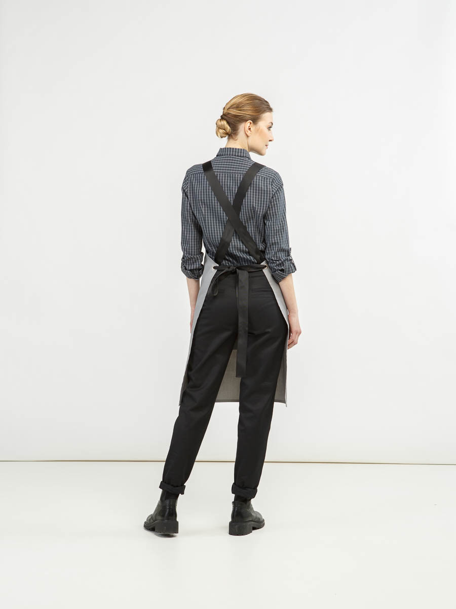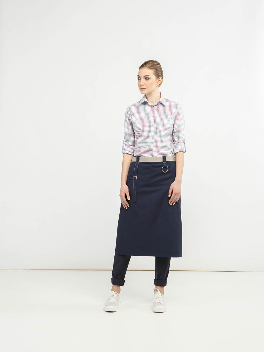 Фартук «unisex» с цельнокроеной грудкой и с бретелями, продетыми через люверсы, переходящими в пояс. По центру нижней части фартука расположен один накладной карман с двумя входами. Бретели выполнены из репсовой ленты контрастного цвета. Закрепки на бретелях оформлены нитками контрастного цвета. Блузка женская полуприлегающего силуэта с центральной потайной застёжкой на 6 петель и пуговиц и одну петлю и пуговицу контрастного цвета на стойке воротника. Рукава длинные, с притачными манжетами, застегивающимися на одну петлю и пуговицу и дополнительной пуговицей для регулировки манжеты по ширине. Рукава трансформируются в короткие - патой и фиксируются прорезной петлей и пуговицей. Углы воротника крепятся к блузке на петлю и пуговицу контрастного цвета.