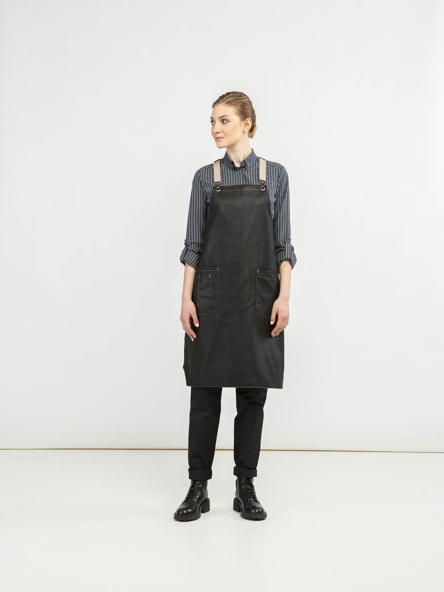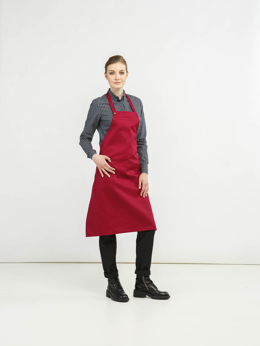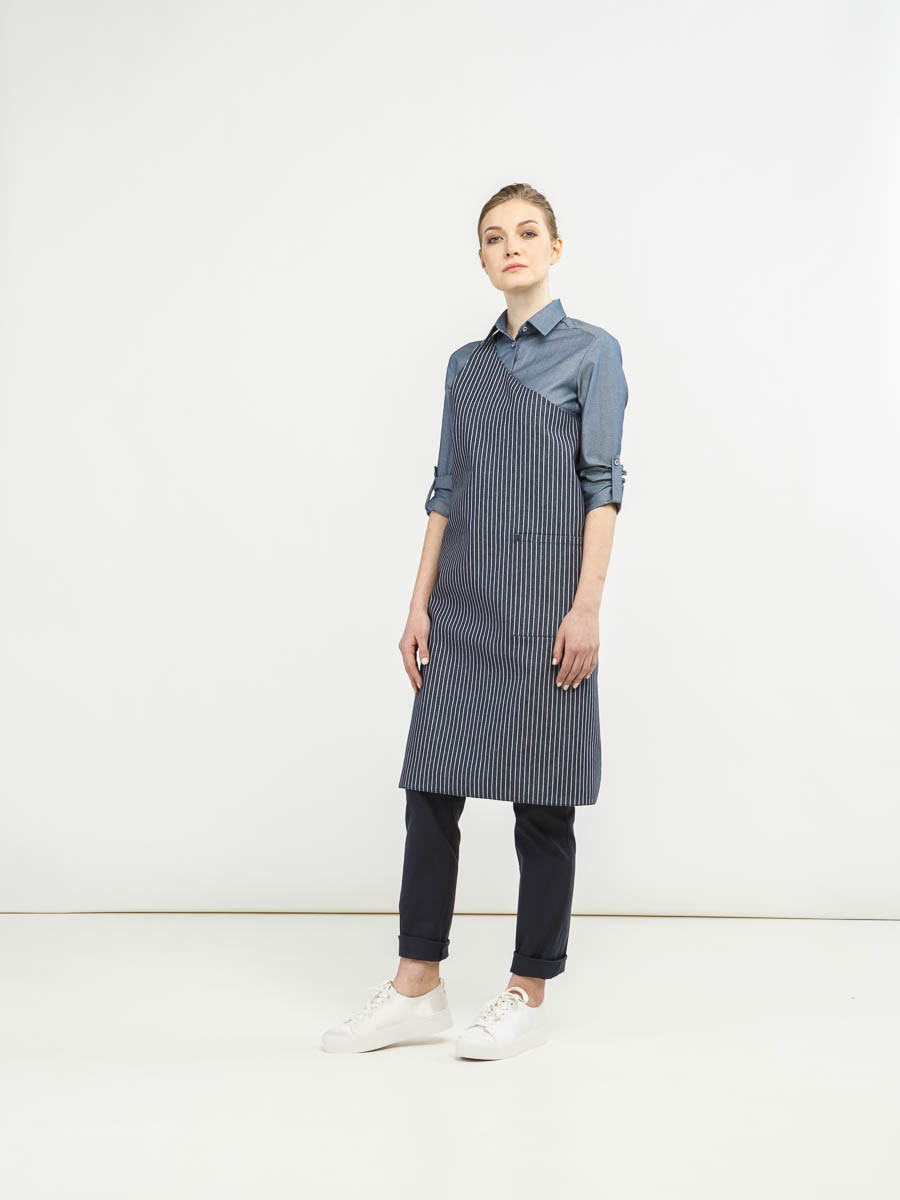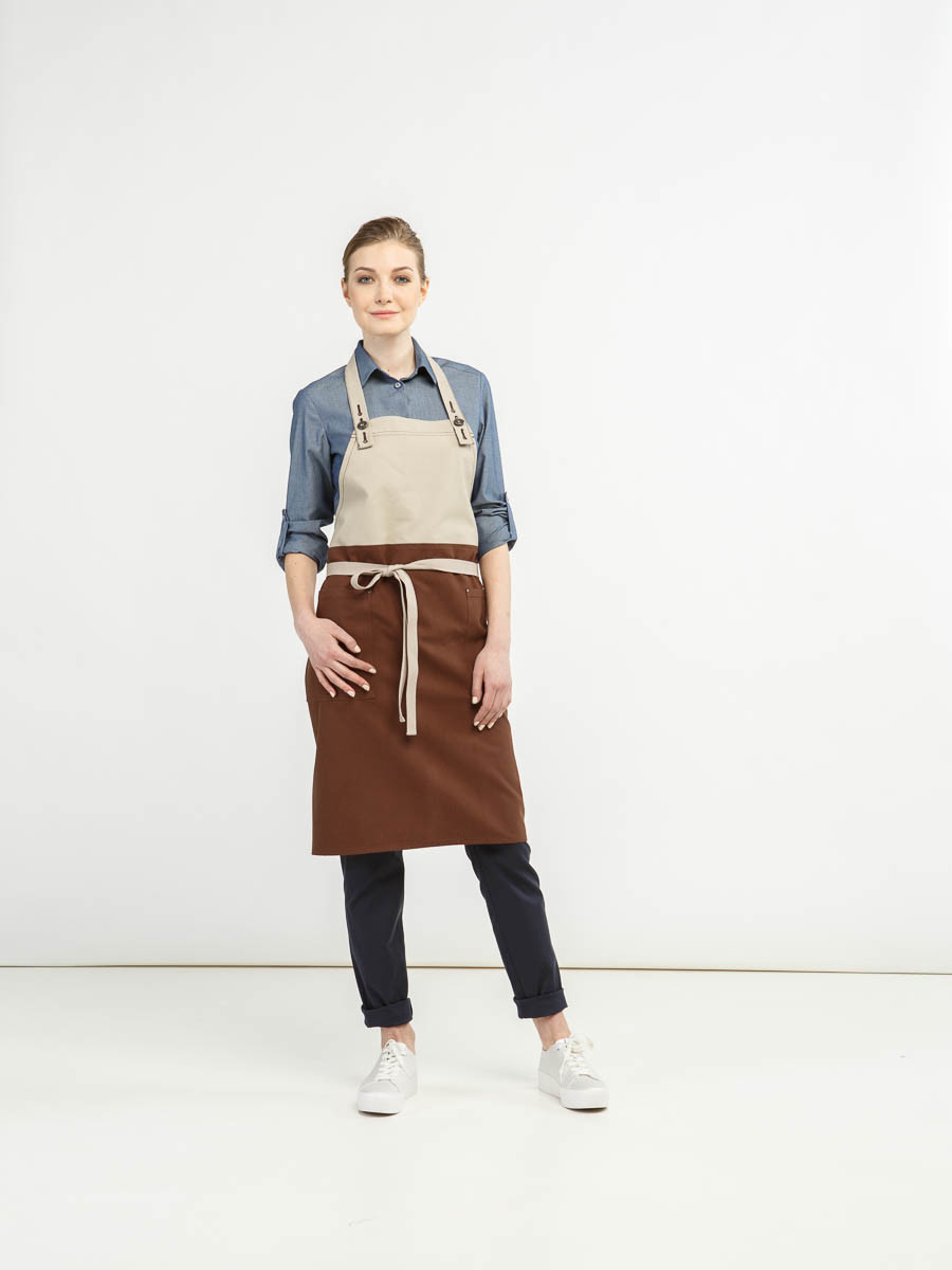 Фартук «unisex» с цельнокроеной грудкой и с бретелями, продетыми через люверсы, переходящими в пояс. По центру нижней части фартука расположен один накладной карман с двумя входами. Бретели выполнены из репсовой ленты контрастного цвета. Закрепки на бретелях оформлены нитками контрастного цвета. Блузка женская полуприлегающего силуэта с центральной потайной застёжкой на 6 петель и пуговиц и одну петлю и пуговицу контрастного цвета на стойке воротника. Рукава длинные, с притачными манжетами, застегивающимися на одну петлю и пуговицу и дополнительной пуговицей для регулировки манжеты по ширине. Рукава трансформируются в короткие - патой и фиксируются прорезной петлей и пуговицей. Углы воротника крепятся к блузке на петлю и пуговицу контрастного цвета.