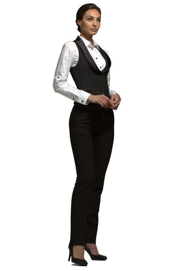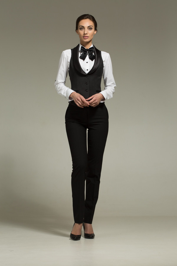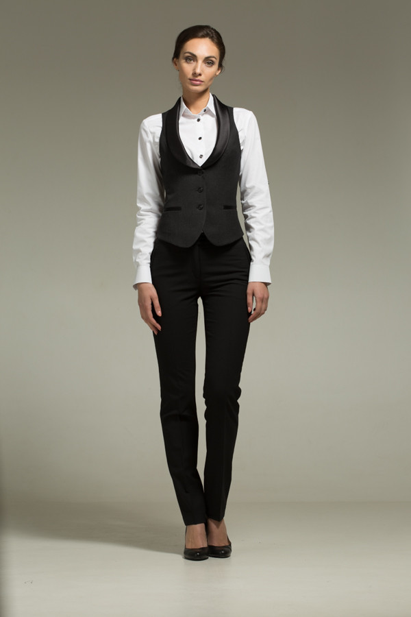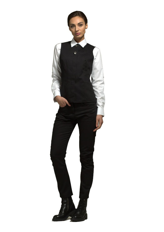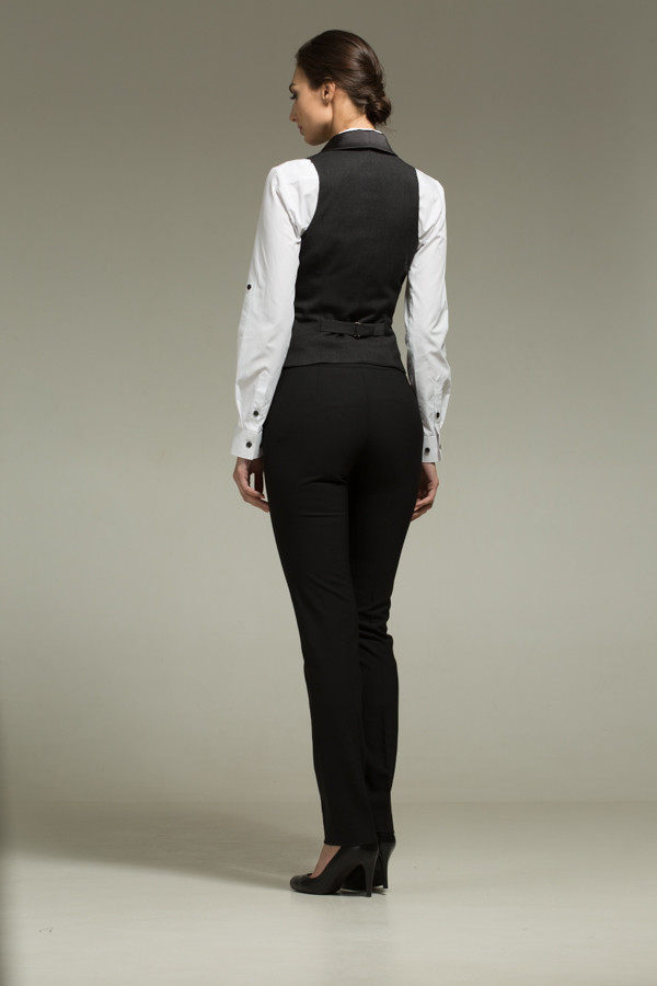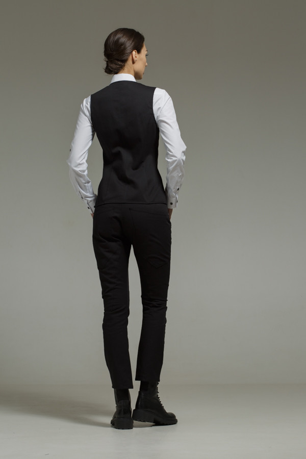 Жилет прилегающего силуэта, с закругленными бортами. Принцип посадки - Slim fit. Центральная бортовая застежка на 3 петли и пуговицы. Спинка со средним швом и рельефными швами из проймы до низа изделия. По линии талии расположен хлястик с пряжкой для корректировки размера. Дополнен двумя прорезными карманами "в рамку". Воротник "шальке" с углубленной горловиной фигурной формы. Воротник и "рамки" карманов модели оформлены отделочной тканью, пуговицы подобраны в цвет отделки. Блуза женская полуприлегающего силуэта с центральной бортовой застёжкой на 7 петель и пуговиц и одну петлю и пуговицу на стойке. Рукава длинные с притачными манжетами, застегивающимися на одну петлю и пуговицу, с дополнительной пуговицей для регулировки манжеты по ширине. Разрез обработан планкой, застегивающейся на одну петлю и пуговицу. По низу рукава одна односторонняя складка. Рукава трансформируются в короткий - патой и фиксируются прорезной петлей на 1 пуговицу. Пуговицы контрастного цвета.