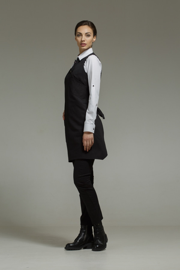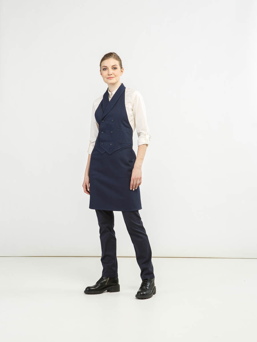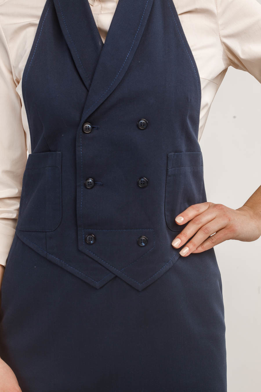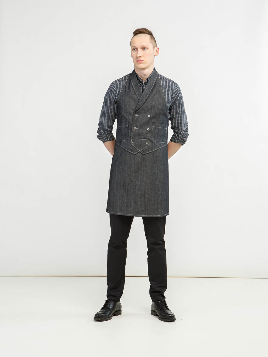 Жилет-фартук «unisex» был разработан с имитацией двубортной застёжки из плотного твила джинсового цвета. Объединяя в себе две модели: жилет и фартук, это изделие решает сразу две задачи. Презентабельный вид и практичность в использовании.