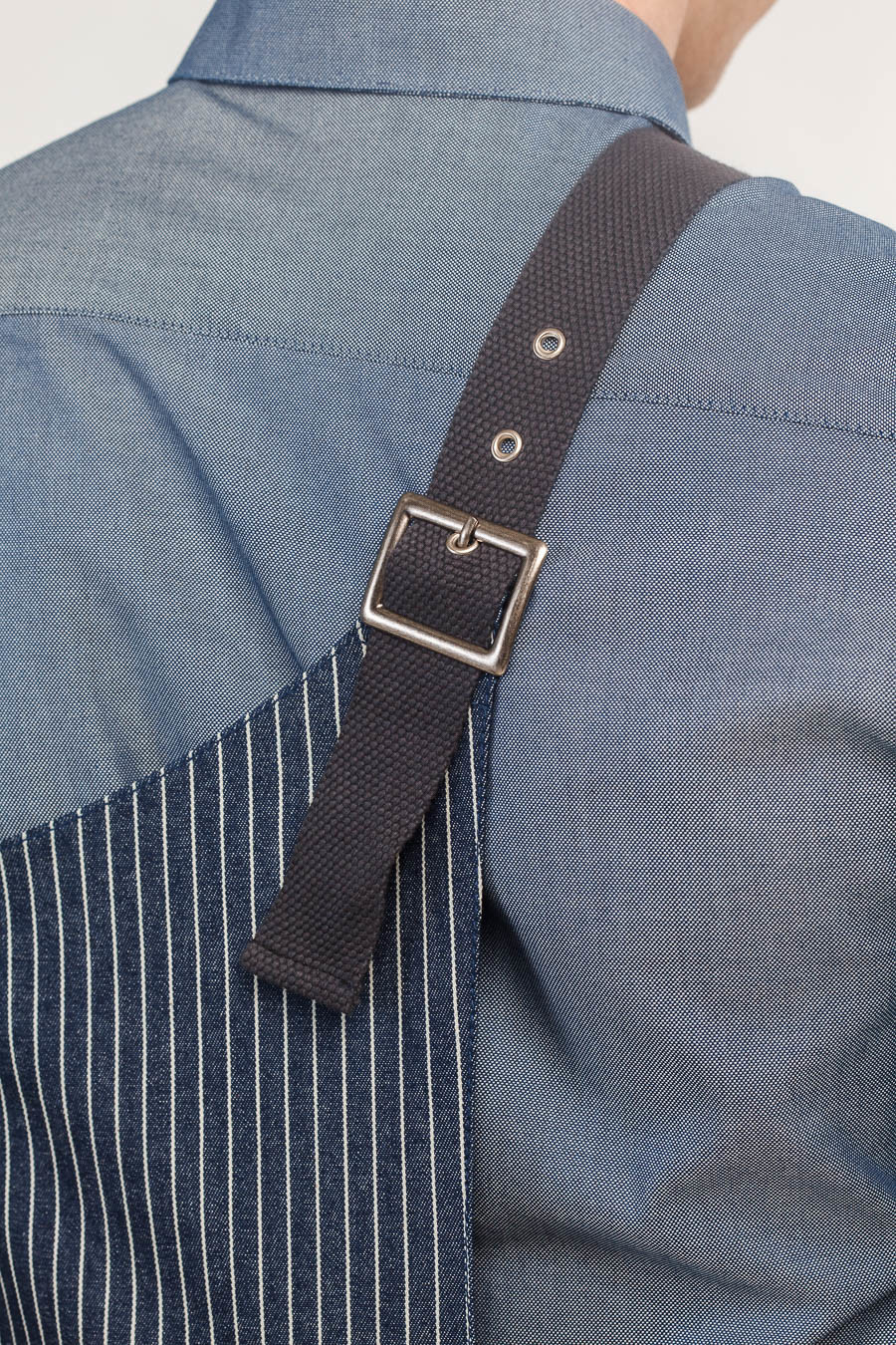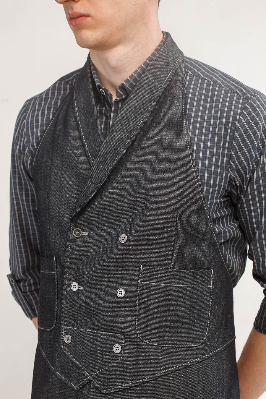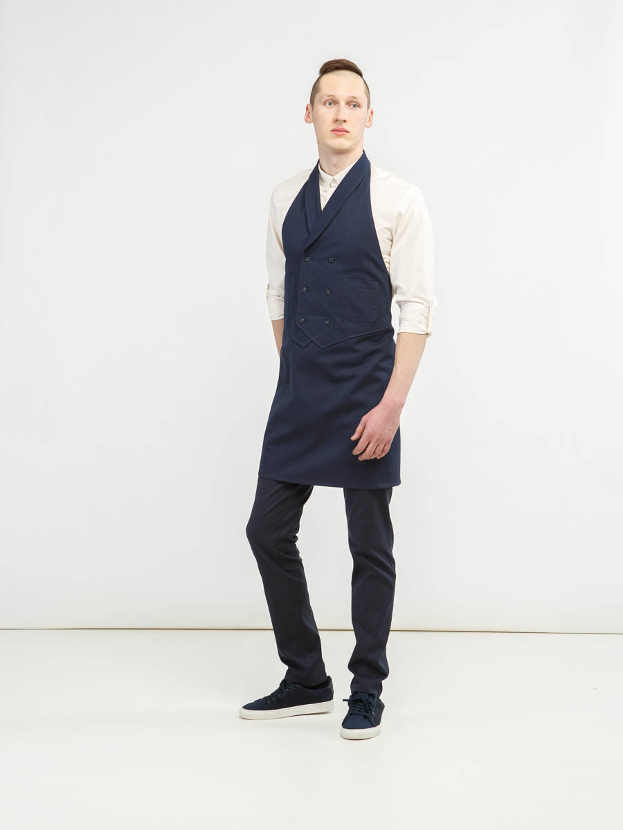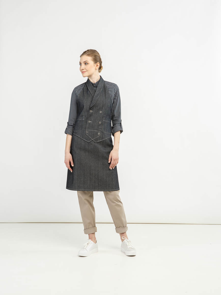 Жилет-фартук «unisex» был разработан с имитацией двубортной застёжки из плотного твила джинсового цвета. Объединяя в себе две модели: жилет и фартук, это изделие решает сразу две задачи. Презентабельный вид и практичность в использовании.