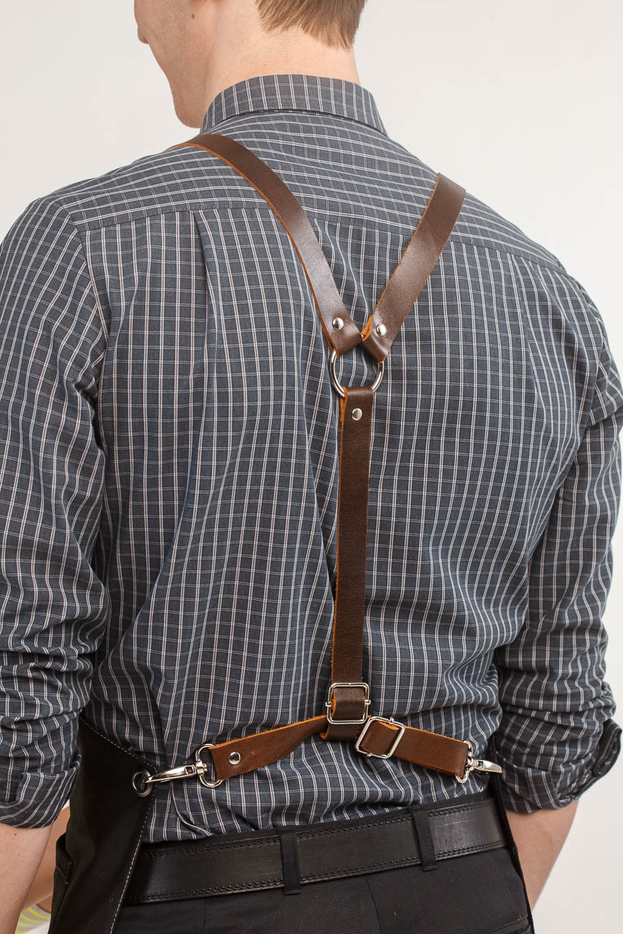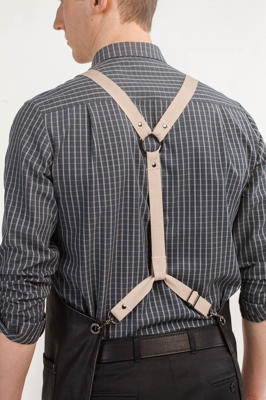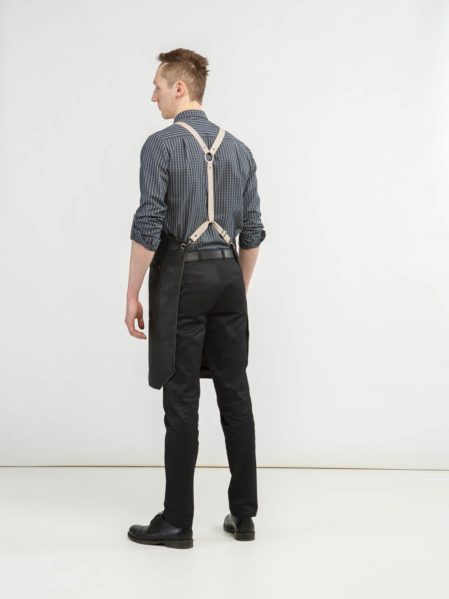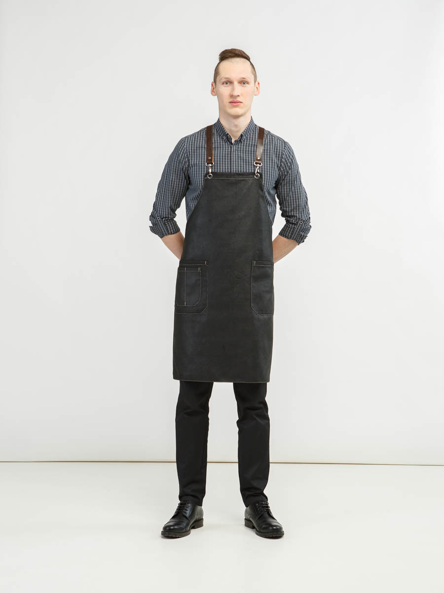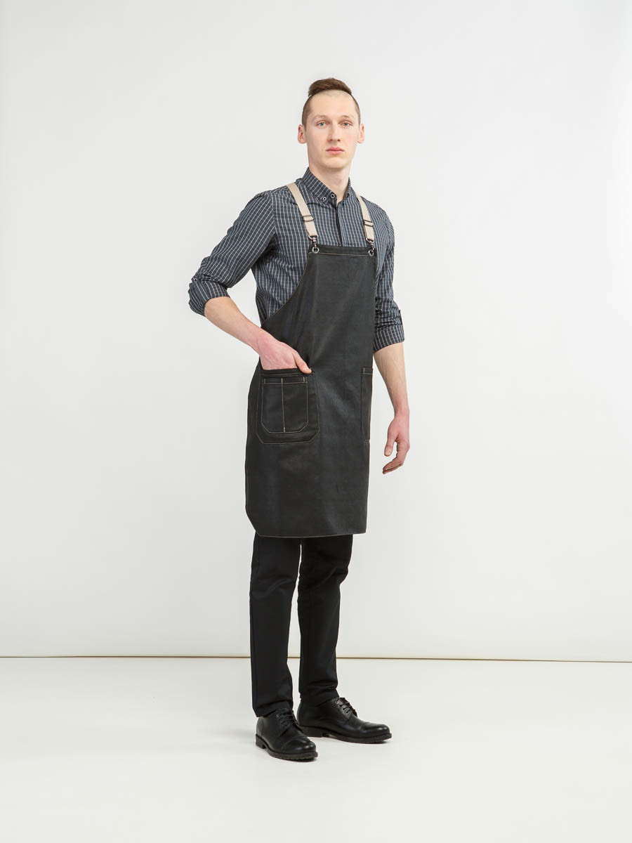Фартук на подкладке с цельнокроеной грудкой, с системой кожаных креплений. Длина фартука по модели 70 см. В нижней части фартука расположены два накладных кармана. Сорочка мужская полуприлегающего силуэта, с центральной потайной застёжкой на 6 петель и пуговиц и одну петлю и пуговицу контрастного цвета на стойке воротника. Рукава длинные с притачными манжетами, застегивающимися на одну петлю и пуговицу, с дополнительной пуговицей. Рукава трансформируются в короткие с патой с 1 прорезной петлей и 1 пуговицей. Углы воротника крепятся к сорочке на петлю и пуговицу контрастного цвета.