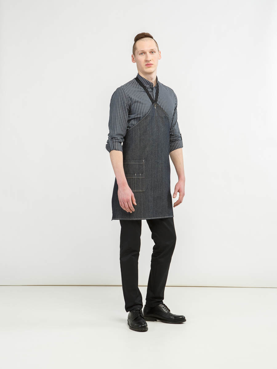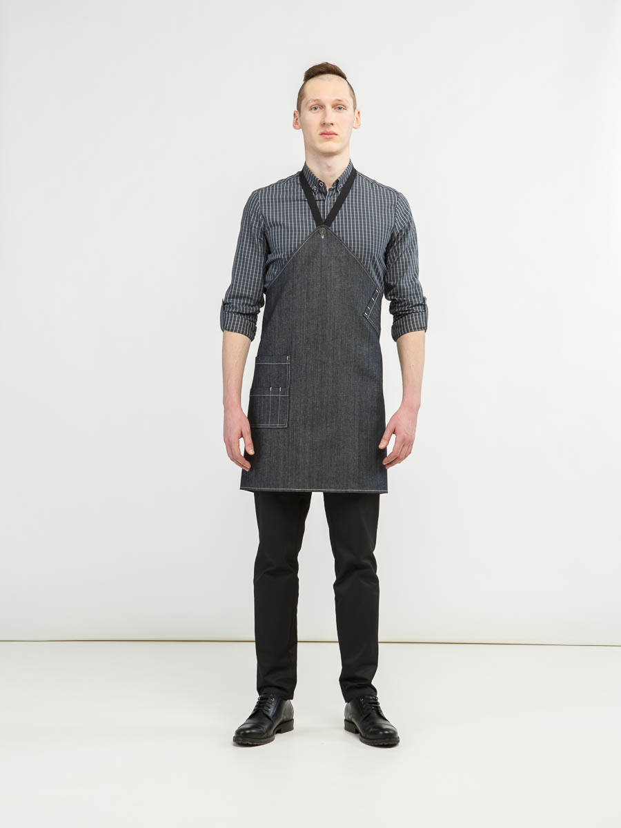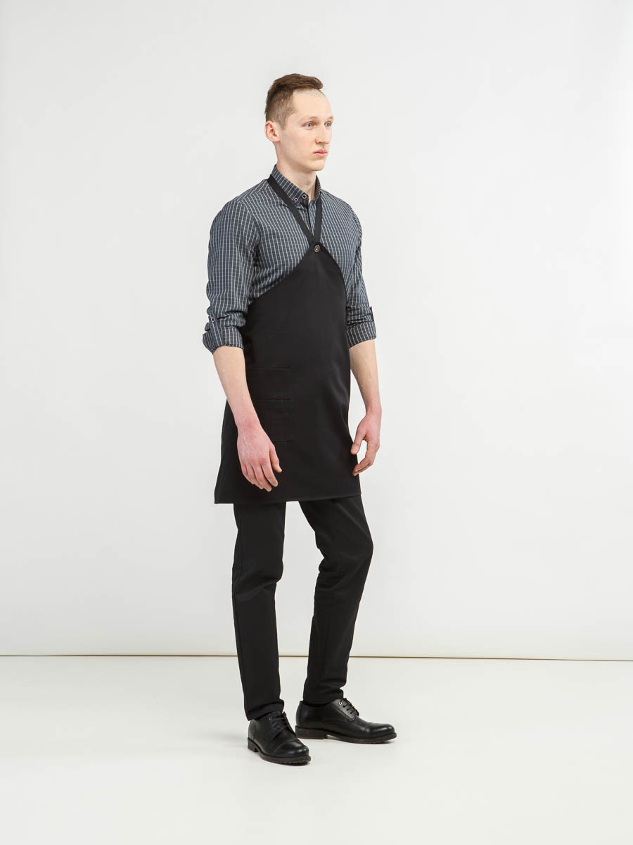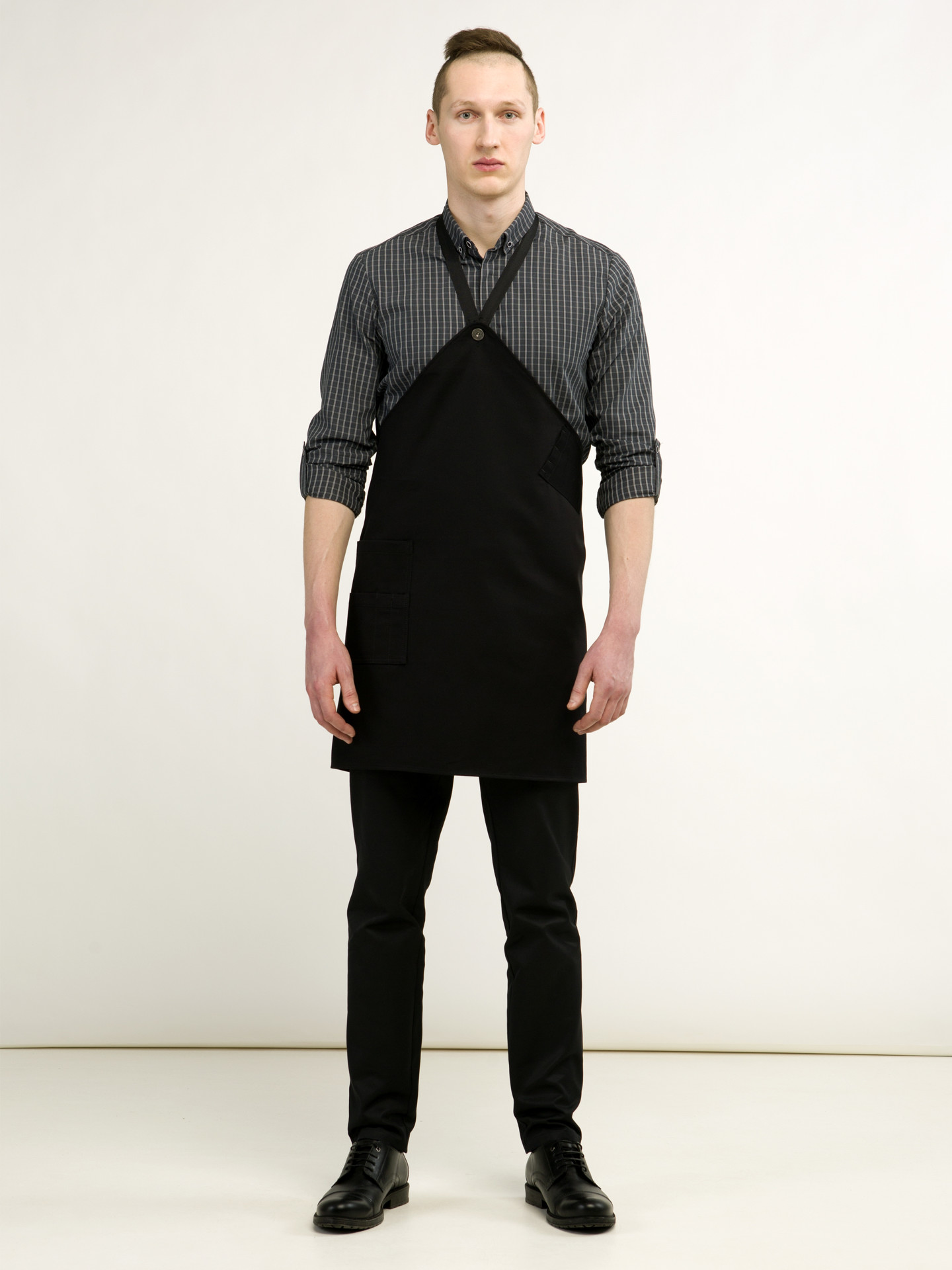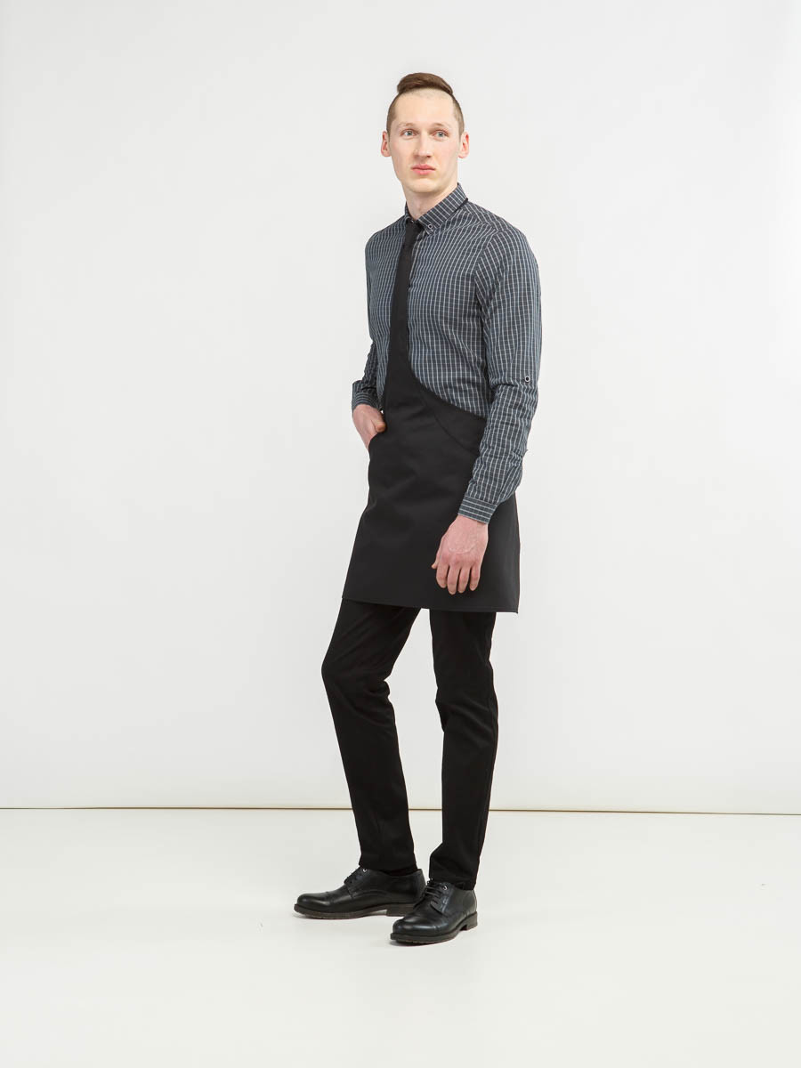 Фартук фигурный с цельнокроеной грудкой на талии завязывается на пояс. Бретель съемная на петле и джинсовой пуговице. С правой стороны двойной накладной карман. С левой стороны нагрудный наклонный накладной карман с тремя входами. Сорочка мужская полуприлегающего силуэта, с центральной потайной застёжкой на 6 петель и пуговиц и одну петлю и пуговицу контрастного цвета на стойке воротника. Рукава длинные с притачными манжетами, застегивающимися на одну петлю и пуговицу, с дополнительной пуговицей. Рукава трансформируются в короткие с патой с 1 прорезной петлей и 1 пуговицей. Углы воротника крепятся к сорочке на петлю и пуговицу контрастного цвета.