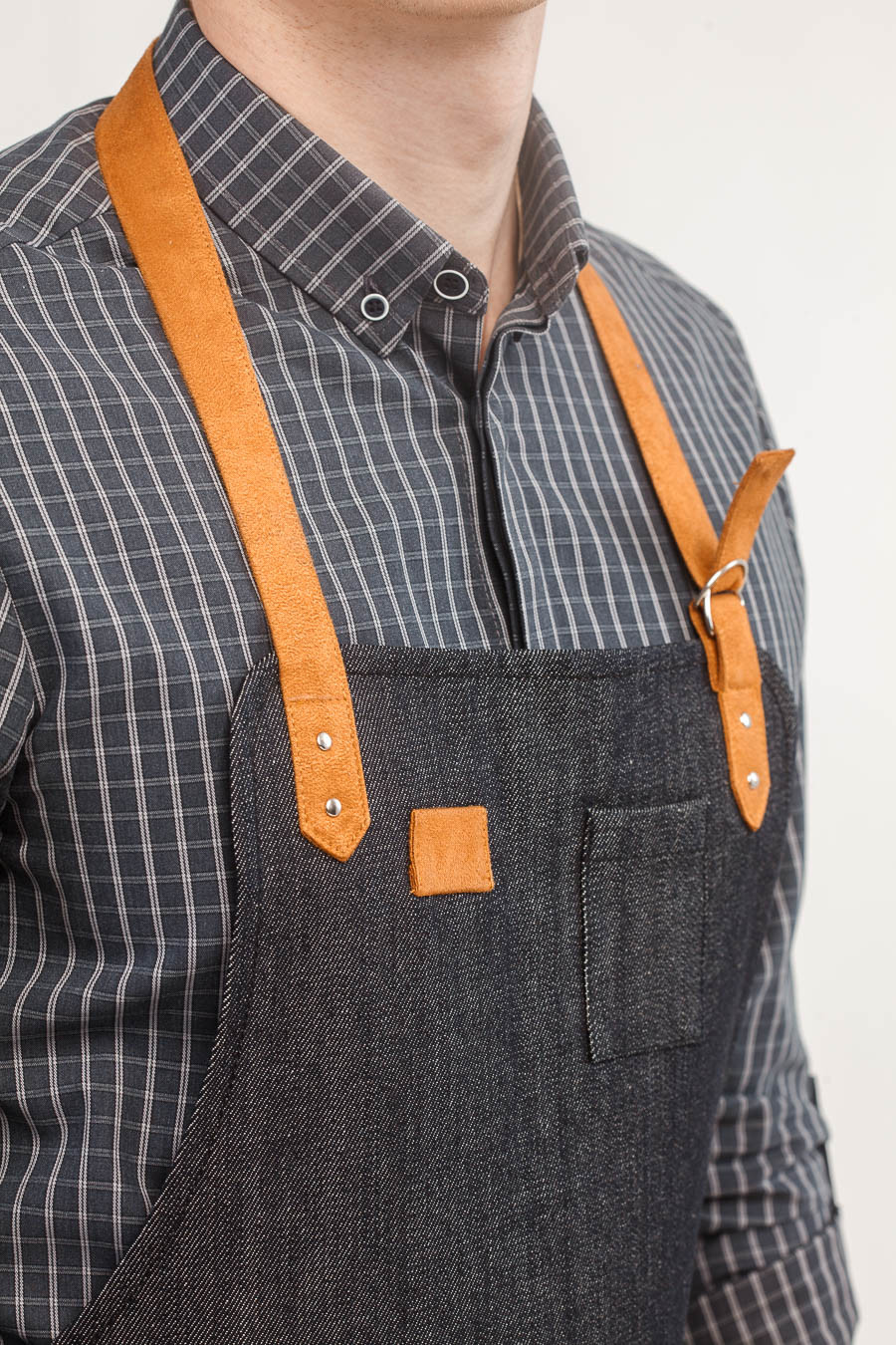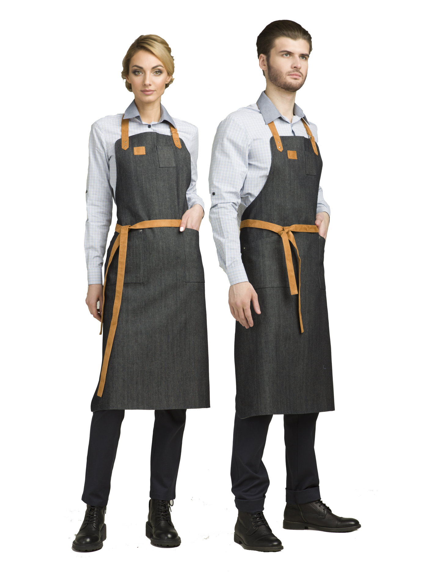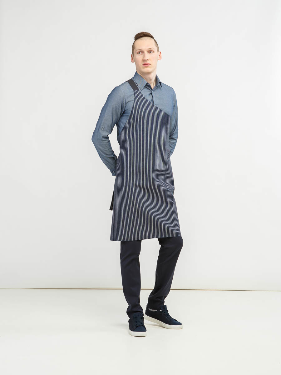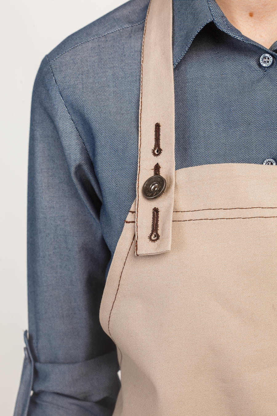 Фартук фигурный с цельнокроеной грудкой на талии завязывается на пояс. Бретель съемная на петле и джинсовой пуговице. С правой стороны двойной накладной карман. С левой стороны нагрудный наклонный накладной карман с тремя входами. Сорочка мужская полуприлегающего силуэта, с центральной потайной застёжкой на 6 петель и пуговиц и одну петлю и пуговицу контрастного цвета на стойке воротника. Рукава длинные с притачными манжетами, застегивающимися на одну петлю и пуговицу, с дополнительной пуговицей. Рукава трансформируются в короткие с патой с 1 прорезной петлей и 1 пуговицей. Углы воротника крепятся к сорочке на петлю и пуговицу контрастного цвета.