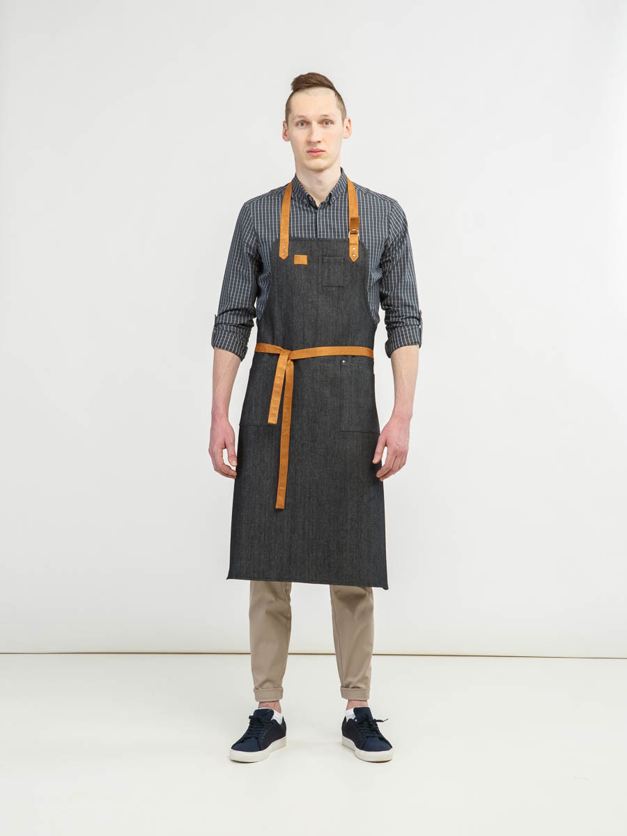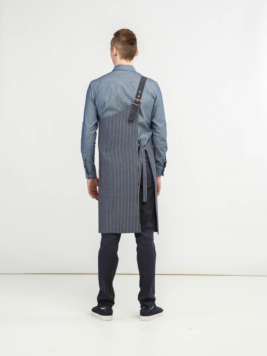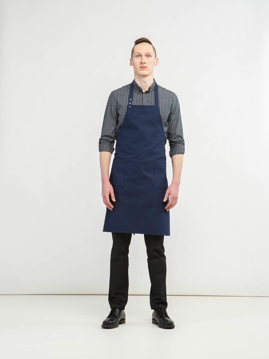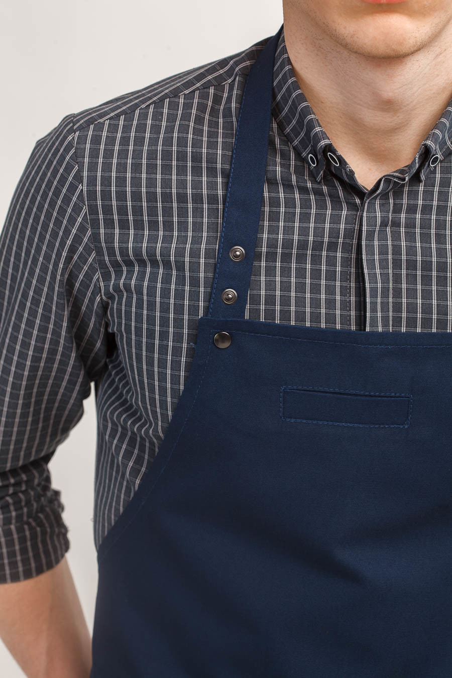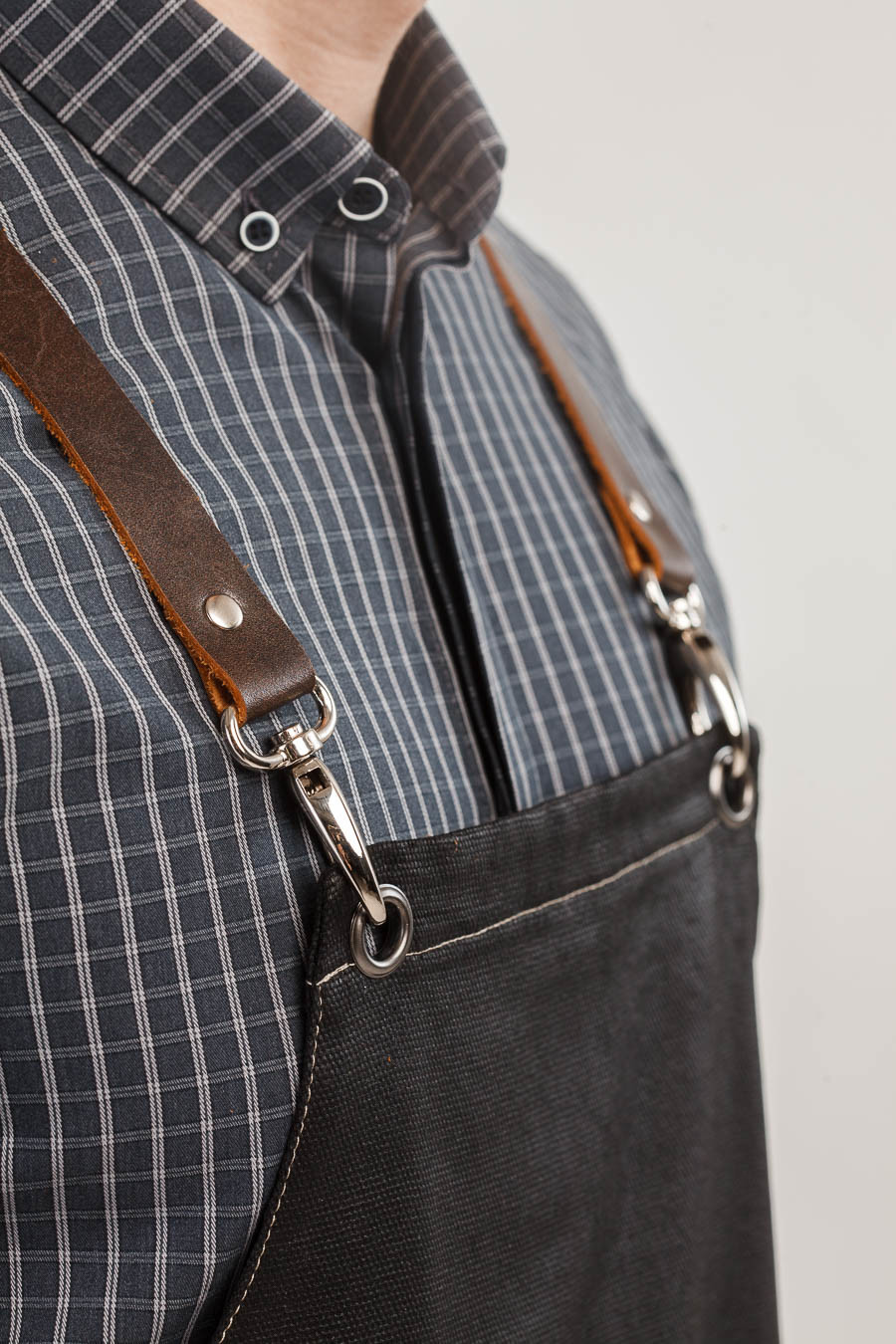 Фартук фигурный с цельнокроеной грудкой на талии завязывается на пояс. Бретель съемная на петле и джинсовой пуговице. С правой стороны двойной накладной карман. С левой стороны нагрудный наклонный накладной карман с тремя входами. Сорочка мужская полуприлегающего силуэта, с центральной потайной застёжкой на 6 петель и пуговиц и одну петлю и пуговицу контрастного цвета на стойке воротника. Рукава длинные с притачными манжетами, застегивающимися на одну петлю и пуговицу, с дополнительной пуговицей. Рукава трансформируются в короткие с патой с 1 прорезной петлей и 1 пуговицей. Углы воротника крепятся к сорочке на петлю и пуговицу контрастного цвета.