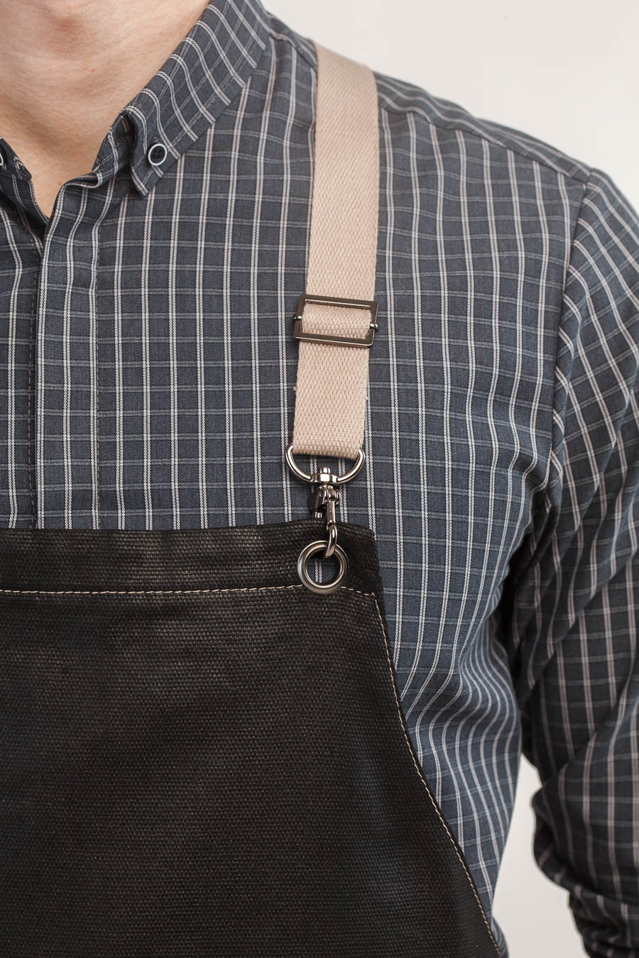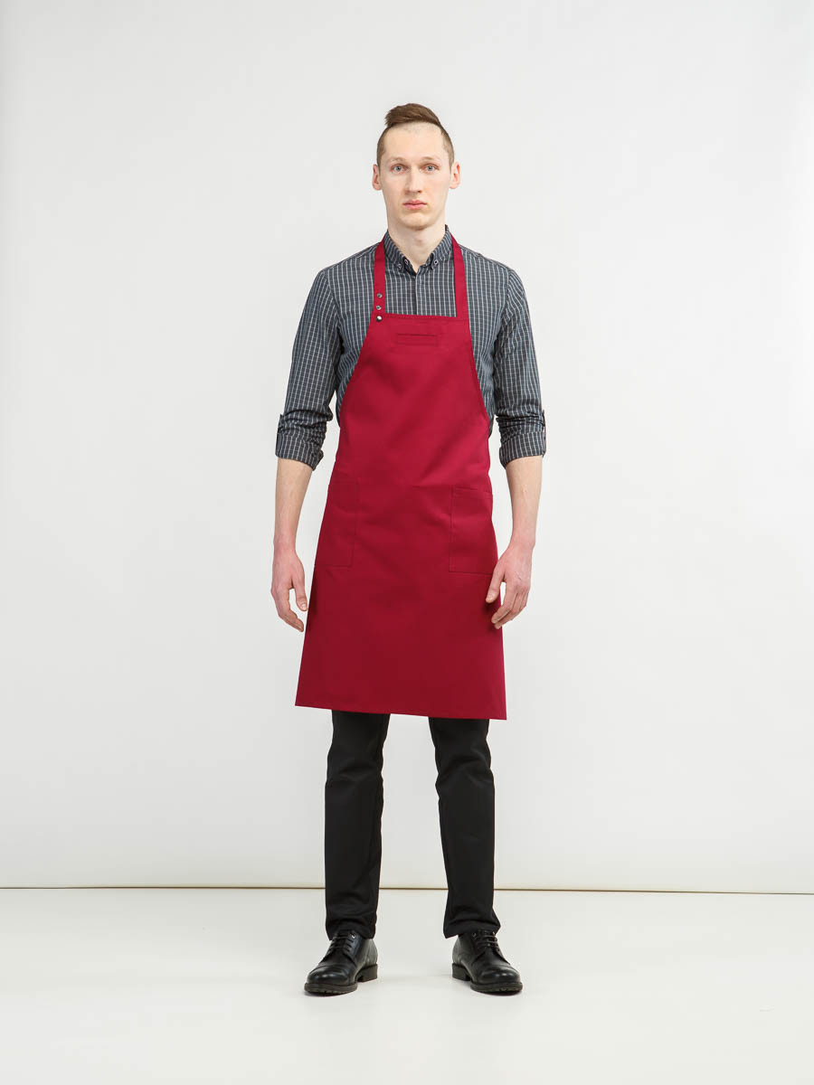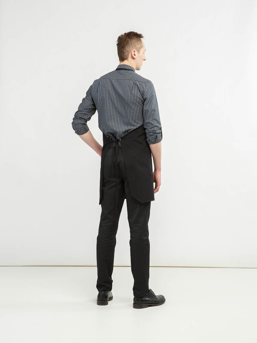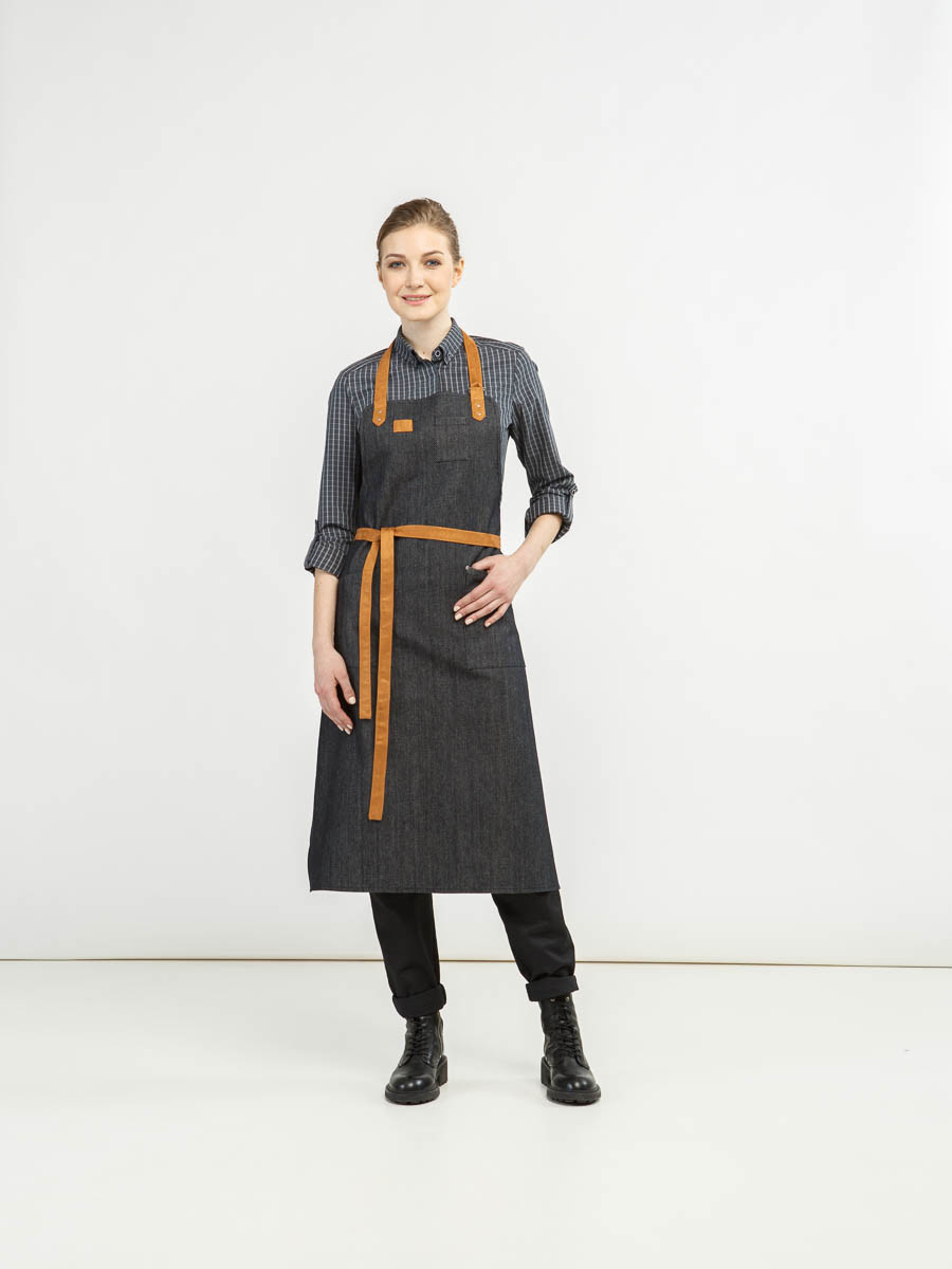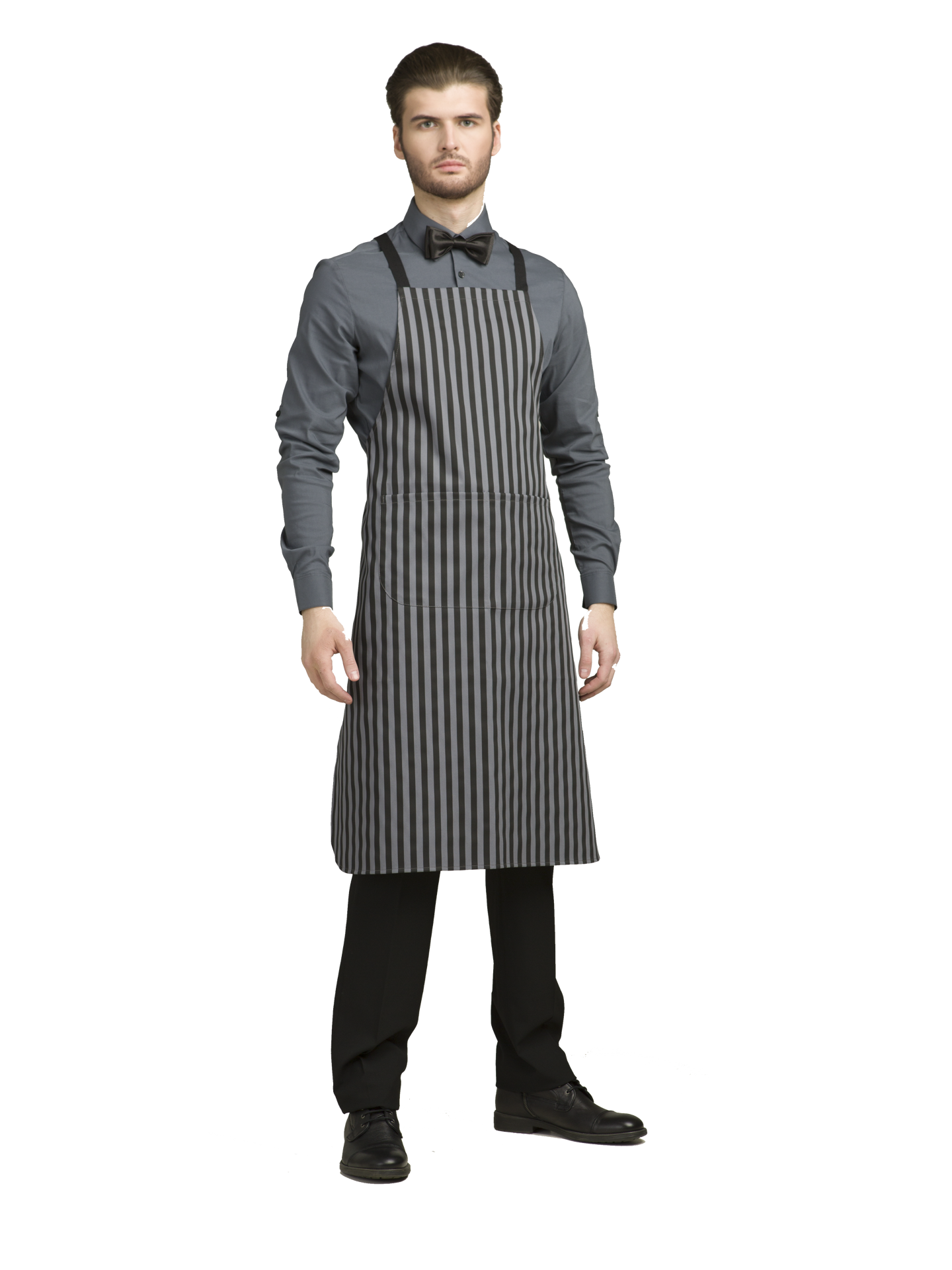 Фартук фигурный с цельнокроеной грудкой на талии завязывается на пояс. Бретель съемная на петле и джинсовой пуговице. С правой стороны двойной накладной карман. С левой стороны нагрудный наклонный накладной карман с тремя входами. Сорочка мужская полуприлегающего силуэта, с центральной потайной застёжкой на 6 петель и пуговиц и одну петлю и пуговицу контрастного цвета на стойке воротника. Рукава длинные с притачными манжетами, застегивающимися на одну петлю и пуговицу, с дополнительной пуговицей. Рукава трансформируются в короткие с патой с 1 прорезной петлей и 1 пуговицей. Углы воротника крепятся к сорочке на петлю и пуговицу контрастного цвета.