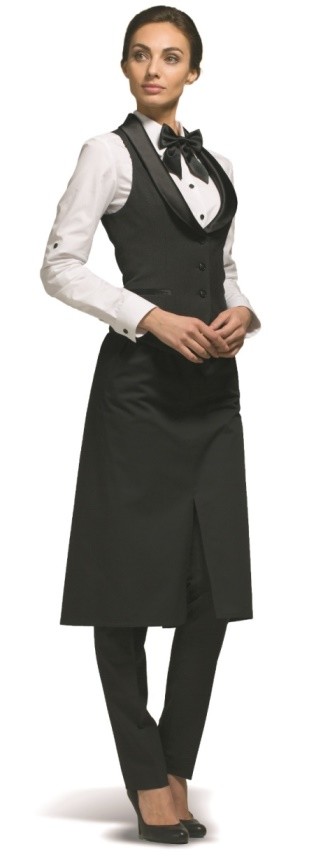 Фартук с цельнокроеной грудкой, бретель с регулировкой на полукольца, на талии завязывается пояс. На цельнокроеной грудке накладной карман и крепление для бейджика. Дополнен двумя накладными фигурными карманами. Бретели и два фигурных кармана крепятся на хольнитены. Бретели, пояс, держатель полуколец и крепление для бейджика выполнены из замши. Блузка женская полуприлегающего силуэта с центральной потайной застёжкой на 6 петель и пуговиц и одну петлю и пуговицу контрастного цвета на стойке воротника. Рукава длинные, с притачными манжетами, застегивающимися на одну петлю и пуговицу и дополнительной пуговицей для регулировки манжеты по ширине. Рукава трансформируются в короткие - патой и фиксируются прорезной петлей и пуговицей. Углы воротника крепятся к блузке на петлю и пуговицу контрастного цвета .