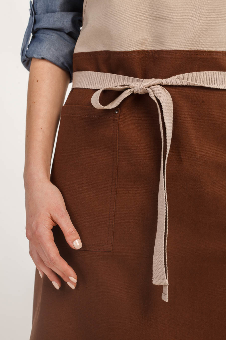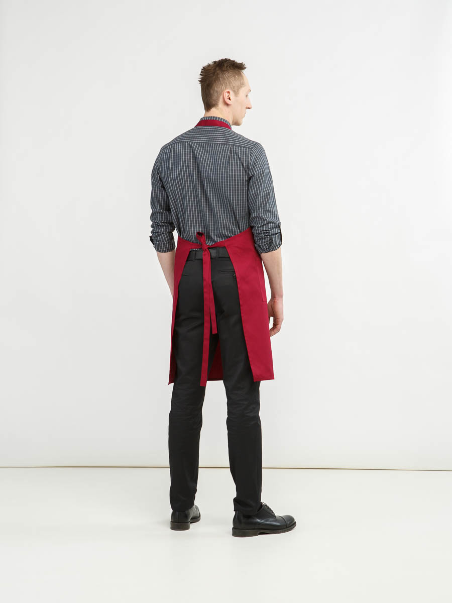 Фартук с цельнокроеной грудкой, бретель с застежкой на регулируемую кнопку. По талии завязывается на пояс. Два боковых накладных кармана. Разрез под галстук по центру грудки обработан по принципу прорезного кармана «листочка». Длина фартука по модели 60 см.