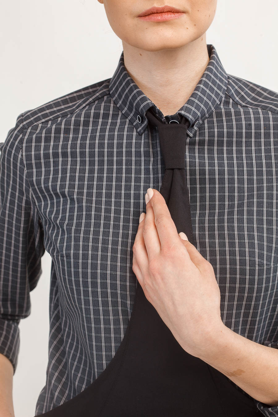Фартук «unisex» с имитацией галстука, переходящего в полотно, смотрится стильно как на мужчине, так и на женщине. Рекомендуется носить с сорочками и блузками со стояче-отложным воротником, что довольно логично для галстука. Блузка женская полуприлегающего силуэта с центральной потайной застёжкой на 6 петель и пуговиц и одну петлю и пуговицу контрастного цвета на стойке воротника. Рукава длинные, с притачными манжетами, застегивающимися на одну петлю и пуговицу и дополнительной пуговицей для регулировки манжеты по ширине. Рукава трансформируются в короткие - патой и фиксируются прорезной петлей и пуговицей. Углы воротника крепятся к блузке на петлю и пуговицу контрастного цвета.